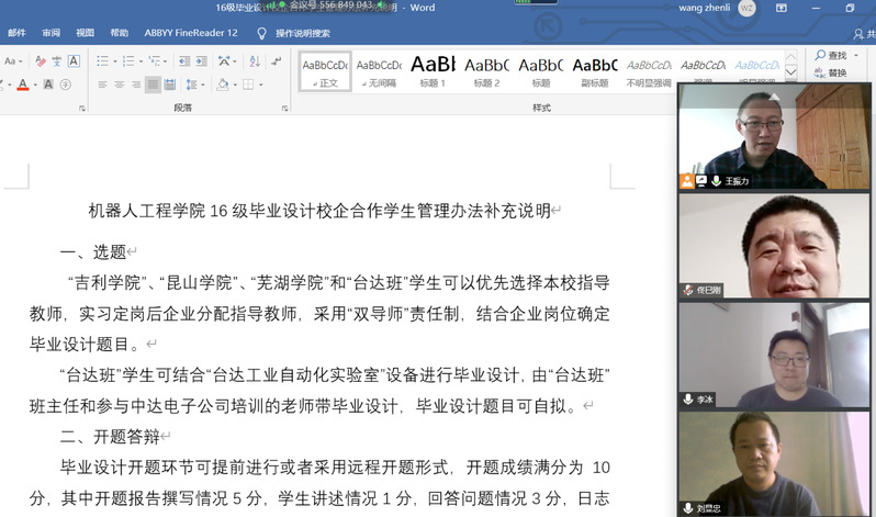 会议内容共分为三部分:第一,2016级学生毕业设计教学环节工作总结,各系主任分别就考研学生、校企合作学生和二次答辩学生毕业设计情况做了汇报;第二,线上实践教学规范化管理,如实验报告撰写及存档、整周实训课教学计划等相关工作做出明确要求;第三,各系汇报2020年春季学期补考工作推进情况,教学指导委员会共同研究补考工作相关问题的解决方案。