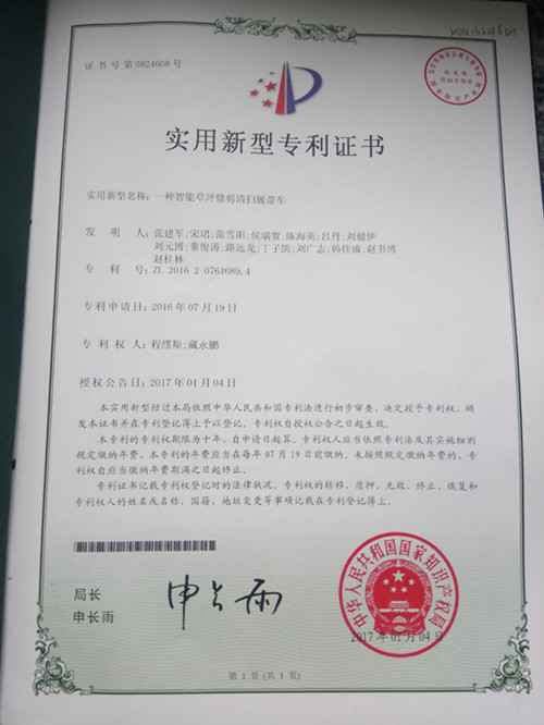 2014级车辆工程专业程缪斯、汽车运用技术专业臧永鹏发明的“一种智能草坪修剪清扫履带车”获得国家实用新型专利