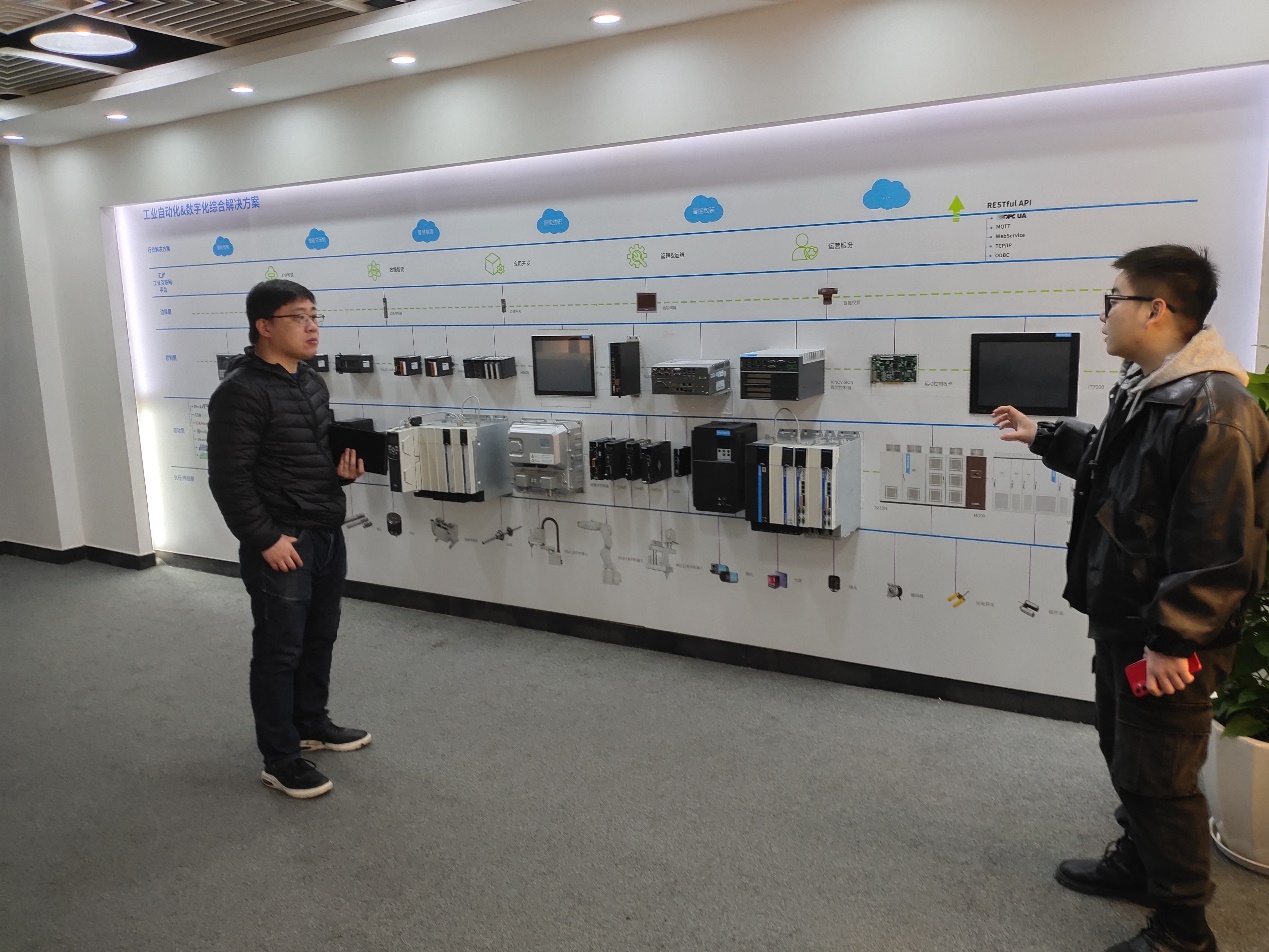 交流后,在倪杰经理的陪同下,调研团队参观了汇川技术总部大楼和生产车间,深入了解了汇川技术在工业自动化行业的发展情况。调研交流中,倪杰经理全面介绍了汇川技术的整体情况,并对自动化人才需求和相关就业岗位进行介绍,。朱斌海副院长对澳门电子pg游戏官网整体情况进行了介绍,并说明了我院专业开设情况,希望双方进一步推进校企深度合作,包括建立订单班等,进一步加强学校与企业的联系。