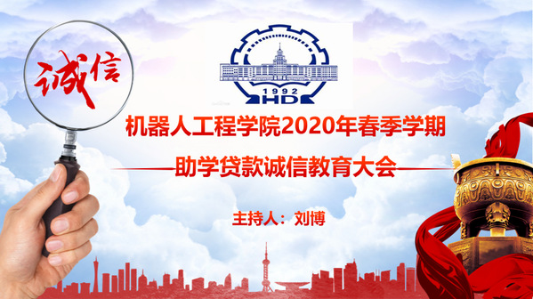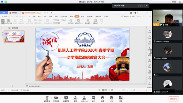 为深入宣传国家资助政策,增强学生诚信意识和感恩意识,切实发挥高校学生资助工作的育人作用,机器人工程学院于5月19日通过“腾讯会议”召开机器人工程学院2020年春季学期助学贷款诚信教育会议。机器人工程学院副院长刘张、团总支书记刘存艳、全体辅导员及办理2020年度黑龙江省国家助学贷款(续贷)学生参加会议,会议由辅导员刘博主持。