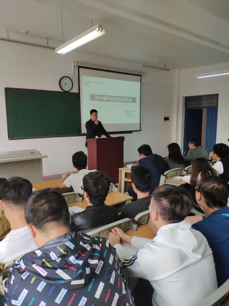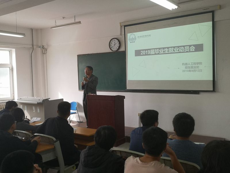 9月12日下午13:45机器人工程学院在教五206召开了2019届毕业生就业动员大会。副校长顾鹂鸣、招生就业处就业指导中心主任张有承、机器人工程学院副院长王振力、机器人工程学院19届毕业生辅导员王韩笑以及机器人工程学院2015级全体学生参加本次会议。