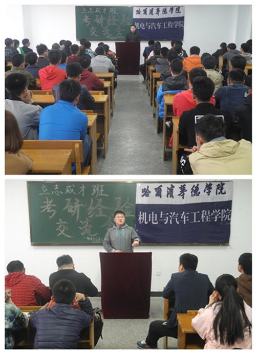 学院2017届成功考取哈尔滨理工大学的1302511班侯平同学和成功考取河南科技大学的1302111班赵伟同为分别在交流会上与学子分享心得体会和交流学习经验方法。之后,学院立志成才班辅导各专业教师分别从高数、政治、英语及专业课方面谈了学习方法和技巧,助力2018届考研学子。
