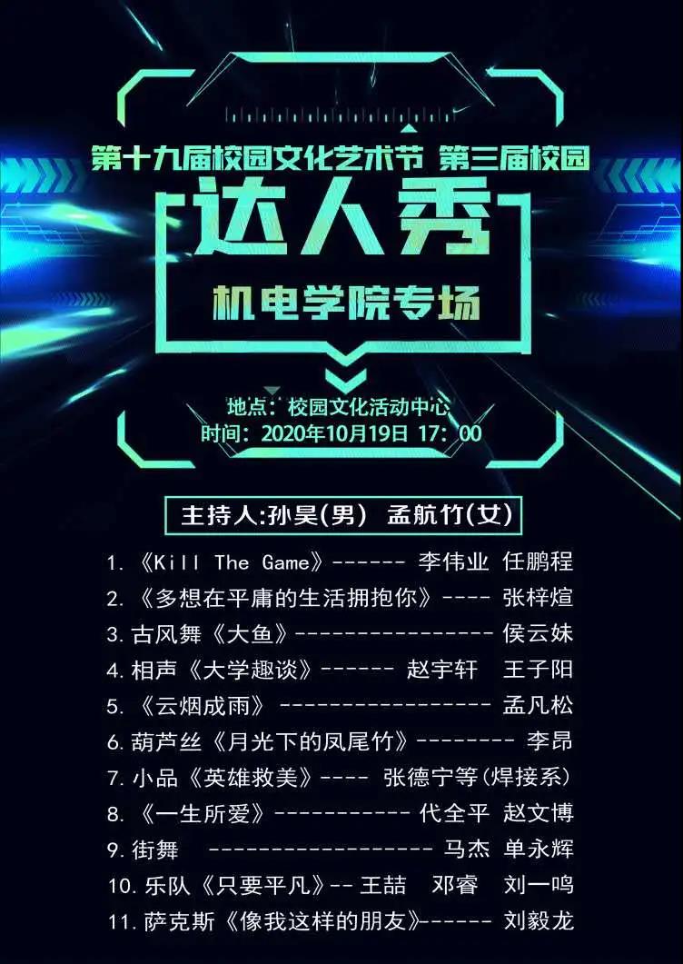 为丰富我院学生校园文化生活,展现学生个性风采,10月19日,机电与材料工程学院于我校学生文化活动中心开展第十九届校园文化艺术节第三届校园“达人秀”机电与材料工程学院专场活动。机电与材料工程学院党总支书记王郁黎、团总支书记杨志承、辅导员金文雯出席,学院近400名学生及兄弟学院学生代表参加此次活动。本次大赛通过线上、线下两种报名方式进行作品征集,最终选择11组选手进入决赛。
