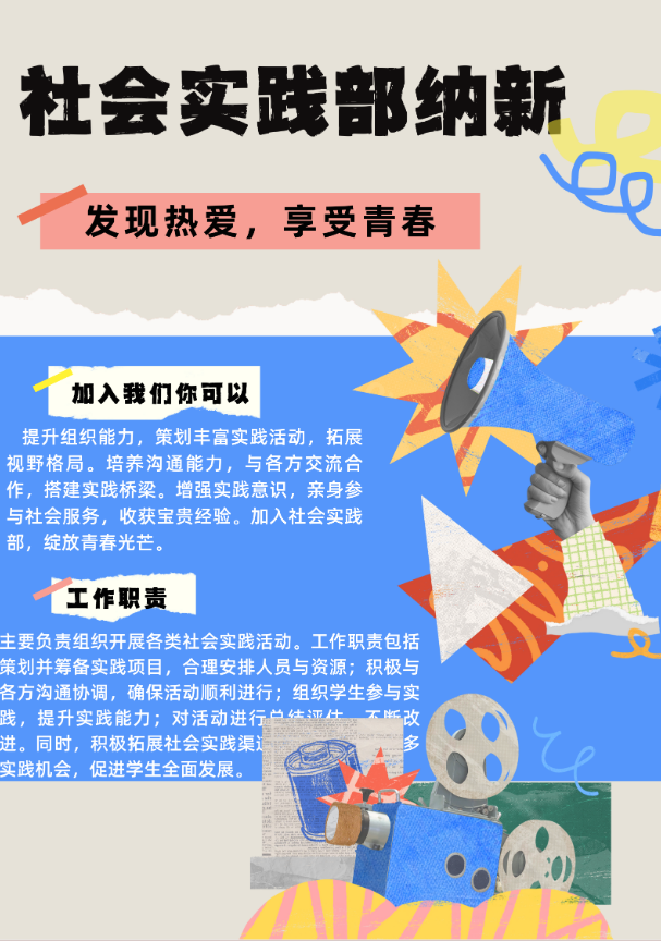 社会实践部是走出校园、拥抱社会的舞台,能参与丰富实践活动,拓展视野、增长见识。走进社区传递关爱,组织公益活动贡献力量,提升组织和沟通能力。雷锋精神践行团传承弘扬雷锋精神,与志同道合伙伴践行奉献、友爱、互助、进步志愿精神,参与志愿服务,宣传雷锋精神。二者结合,碰撞无限可能与精彩,既锻炼自己又收获心灵满足。渴望成长、热心公益、想为大学生活添彩的你,别犹豫,加入我们,在社会实践中践行雷锋精神,绽放青春光彩!