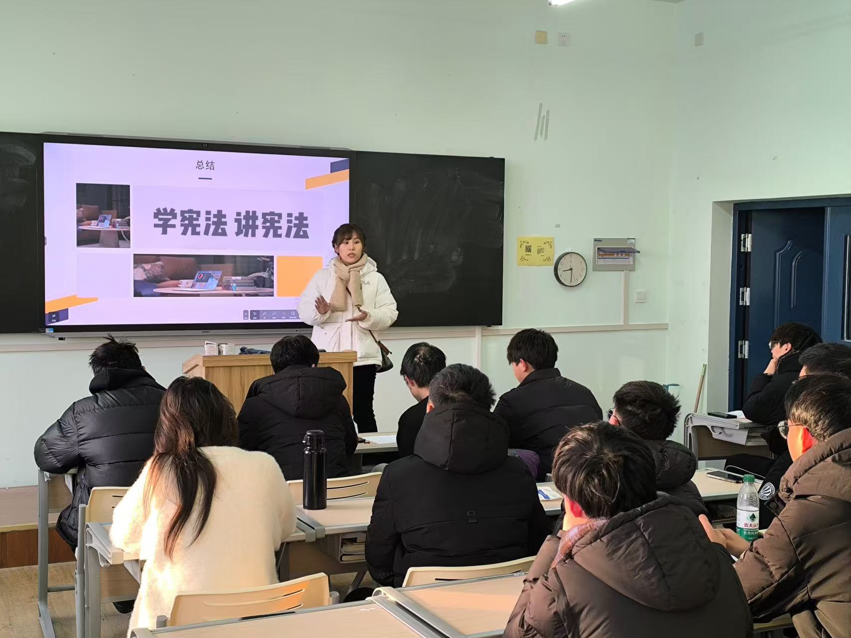 本次班会围绕宪法主题展开了丰富多样的内容。各辅导员老师通过讲解宪法的重要地位和作用,让同学们对宪法有了更清晰的认识。随后,他们以生动的案例分析,引导同学们思考宪法与日常生活的紧密联系,使他们明白宪法对每个人的意义。