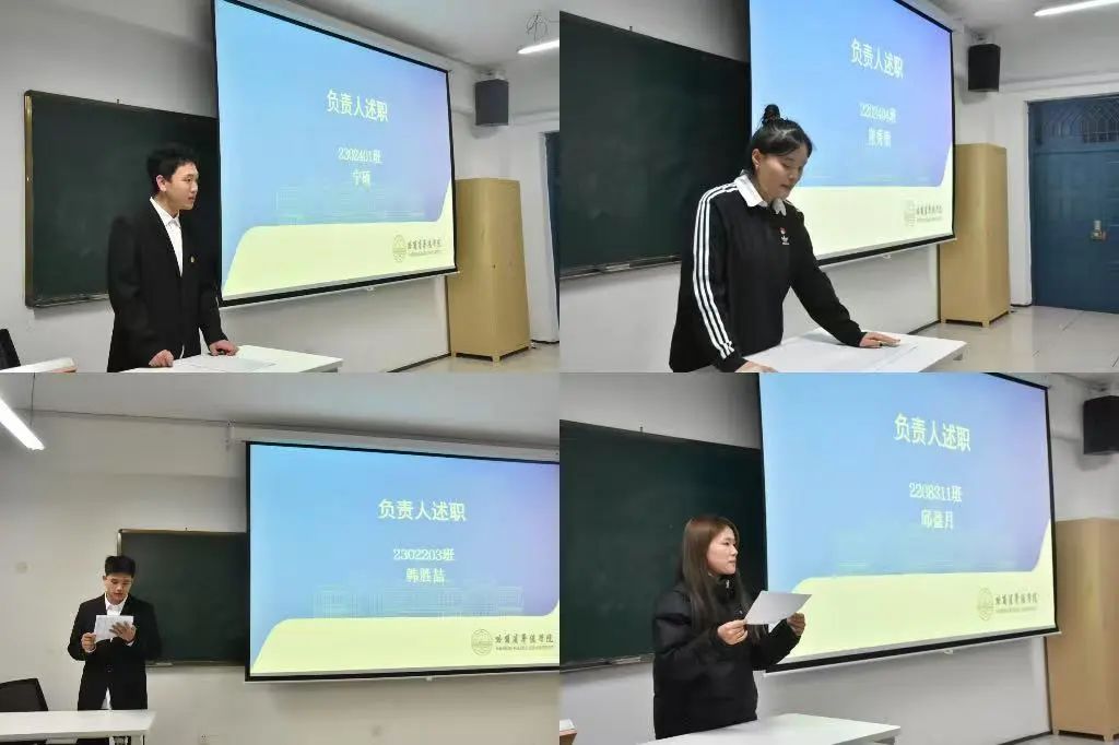 随后,志愿团学生负责人逐一进行述职汇报。2202404班学习委员崔秀萌从基本情况入手,详细阐述了本学期志愿团工作内容的变化与革新;2208311班团支书邱盈月以细节为切入点,向与会人员展示志愿团成员在工作过程中留存的精彩瞬间;2302401班班长宁硕、2302203班组织委员韩胜喆分别汇报了志愿团成员开学至今的执勤次数、到岗签到,用数据说明志愿团在秋季学期的运转情况。