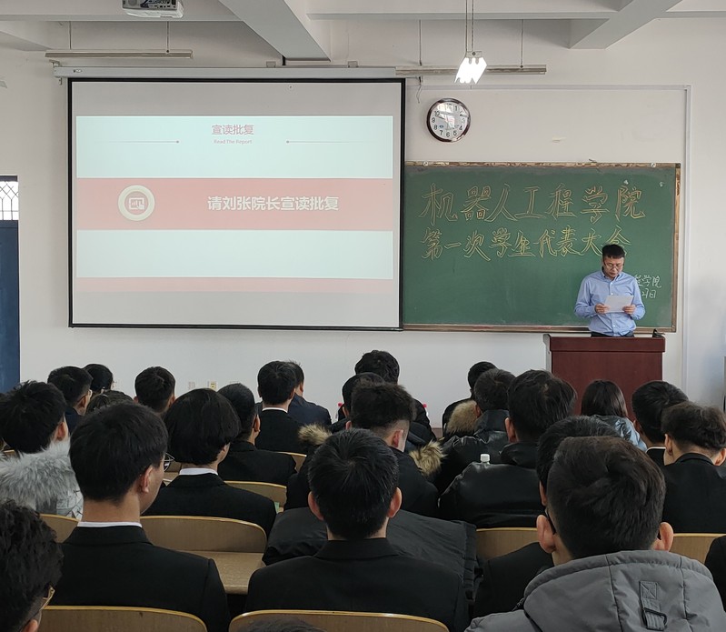 2019年11月27日中午11点40分机器人工程学院第一次学生代表大会在教五101隆重举行。院党总支书记刘显忠、党总支副书记刘张、校团委组织部部长刘守佳、院团总支书记刘存艳、学院全体辅导员及院第三届学生会主席团代表参加活动。院团总支书记刘存艳老师主持会议。