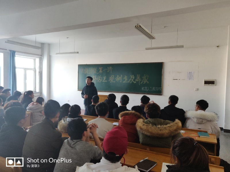2018年12月6日,机器人工程学院2018年秋季学期初级团课第一讲——良好的三观树立及养成在教五202举行。本次培训由机器人工程学院副院长刘张主讲,院学生会主席刑一伟组织培训,94名干事参加培训。