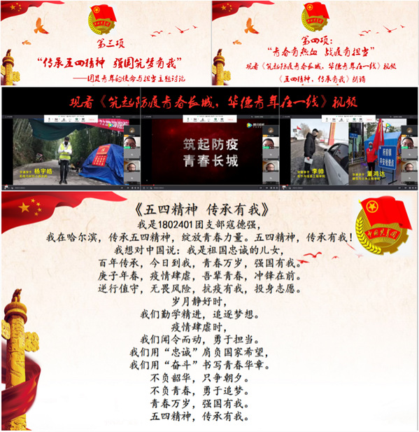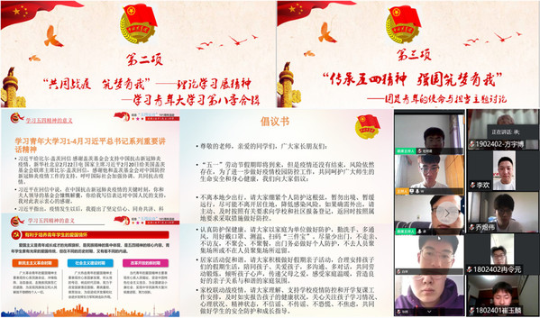 本次团日活动,学院所有团支部严格规范活动流程,做到人人参与,事事尽心。面对着屏幕唱团歌、重温入团誓词;通过理论学习增强自信,并将爱国主义教育植入到团日活动中;不负青春,勇于追梦,让家国情怀始终成为人生底色。团日活动充分展现了各团支部成员凝心聚力抗击疫情的决心,团员青年纷纷表态,将努力成长为能够担当民族复兴大任的时代新人。