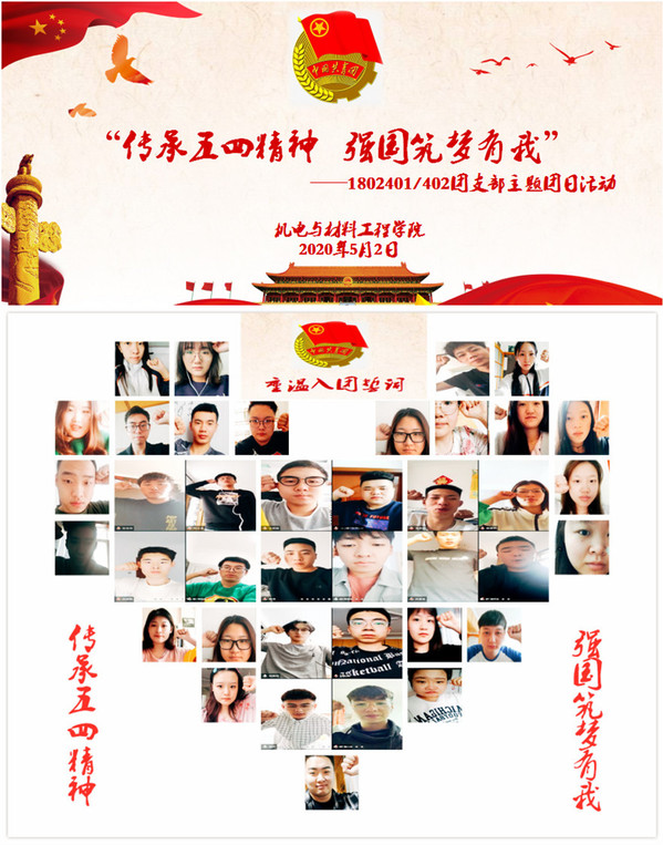 为加强我院团员青年日常教育管理,引导团员青年牢固树立“四个意识”,坚定“四个自信”,坚决做到“两个维护”,用奋斗的青春展现时代新人的家国情怀,5月1日-4日,机电学院团总支积极组织各团支部开展“传承五四精神,强国筑梦有我”网络主题团日活动。活动开展期间,支部成员群策群力,以大我的姿态抗疫,以小我的姿态力行,充分利用新媒体平台,展现了支部活动的与时俱进。