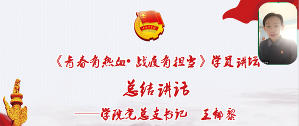 6月7日,机电学院团总支通过团课“云”发声的形式开展2020年春季学期初级团校《青春有热血•战疫有担当》学员讲坛,学院党总支书记王郁黎、团总支书记杨志承、全体辅导员及初级团校全体学员参加培训,会议由初级团校负责人1802111班王传胤主持。