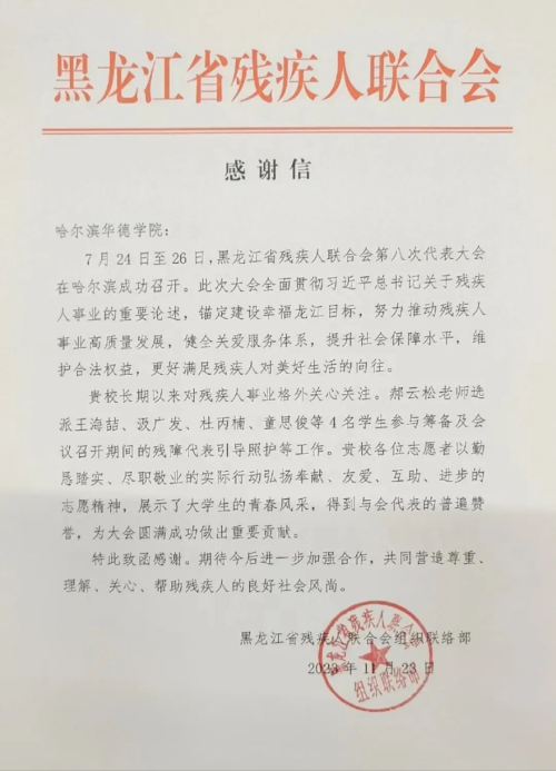 来自黑龙江省残疾人联合会的感谢信,对我校学生在黑龙江省残疾人联合会第八次代表大会期间提供的志愿服务给予高度赞扬