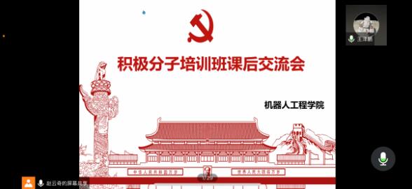 为更好地巩固党课学习成果,加强入党积极分子理论知识武装,提高学员的党性修养,2021年3月26日,机器人工程学院党总支通过腾讯会议在线上召开了2021年春季学期党校课后学习交流会,2021年春季学期入党积极分子培训班学员参加交流会,交流会由学院党总支宣传委员王泽鹏主持。