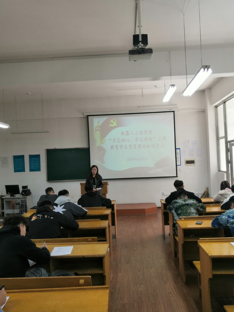 为全面检验“不忘初心、牢记使命”主题教育集中学习成效,增强党员树牢“四个意识”、坚定“四个自信”、做到“两个维护”的思想自觉和行动自觉。10月21日中午,机器人工程学院学生党支部在教六107教室举行“不忘初心、牢记使命”主题教育知识考试。20名学生党员参加考试。