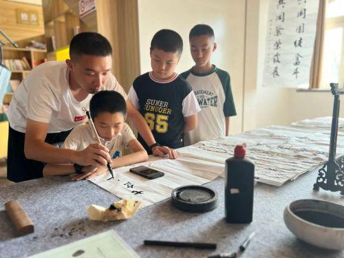 图为小朋友们在团队成员的协助下完成毛笔字的书写