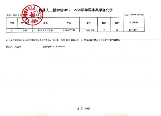 机器人工程学院2019-2020学年国家奖学金公示