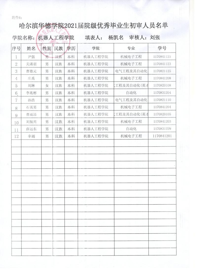 澳门电子pg游戏官网机器人工程学院2021届院级优秀毕业生初审人员名单