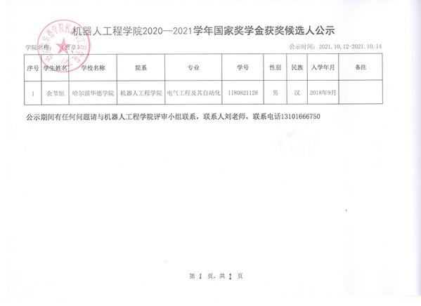 机器人工程学院2020-2021学年国家奖学金获奖候选人公示