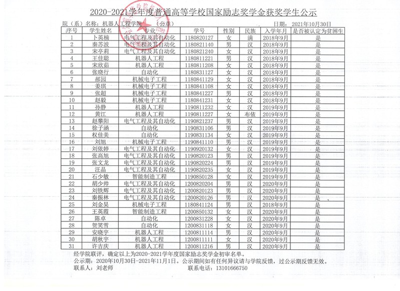 2020-2021学年普通高等学校国家励志奖学金获奖学生公示