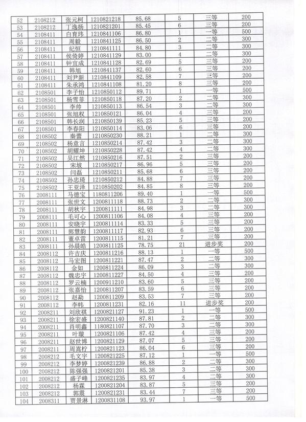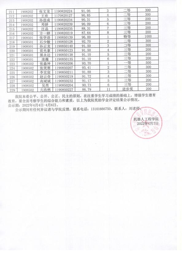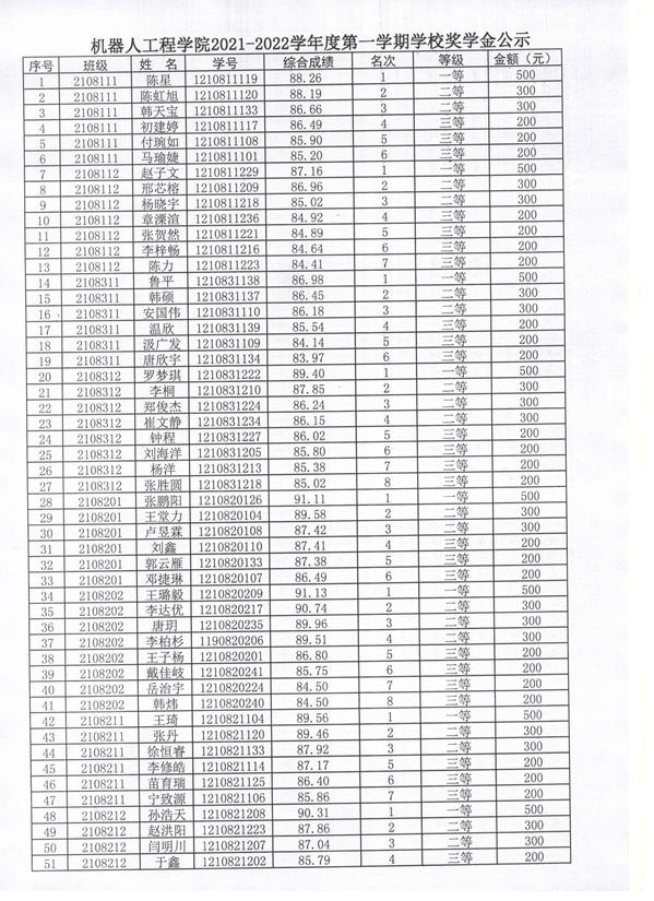 机器人工程学院2021-2022学年度第一学期学校奖学金公示