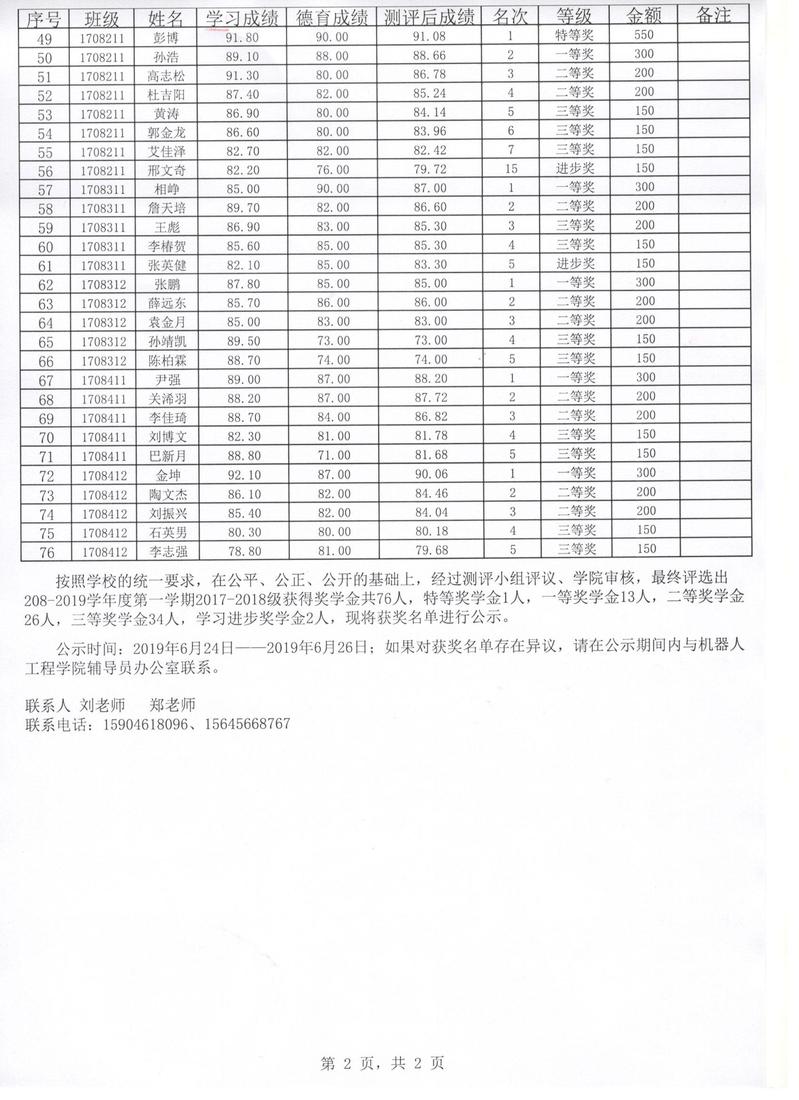 机器人工程学院2018-2019学年度第一学期奖学金公示名单