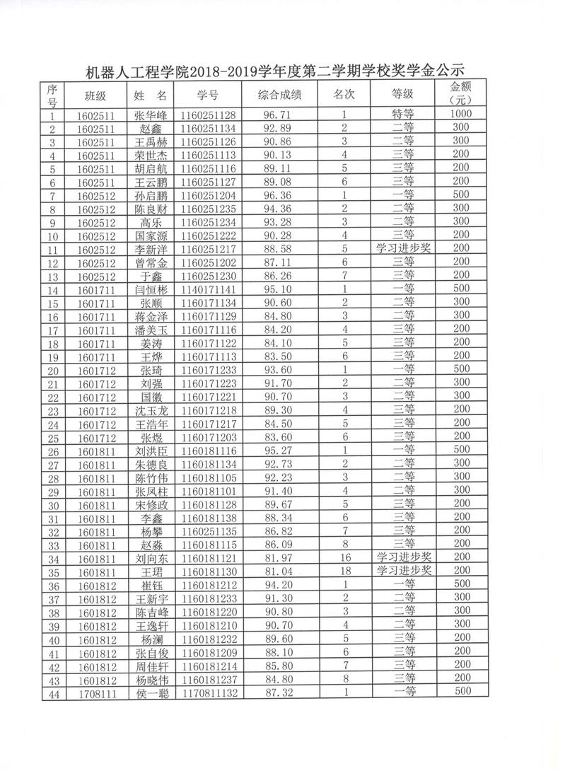机器人工程学院2018-2019学年度第二学期学校奖学金公示