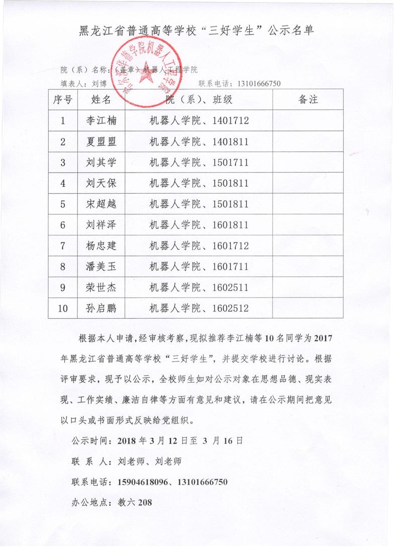 黑龙江省普通高等学校“三好学生”公示名单