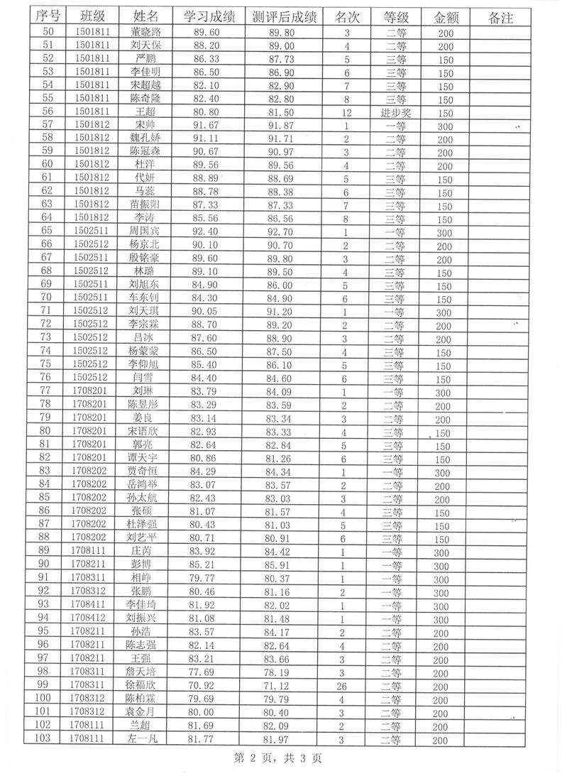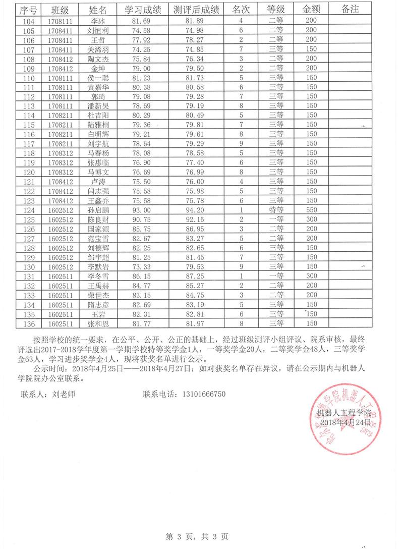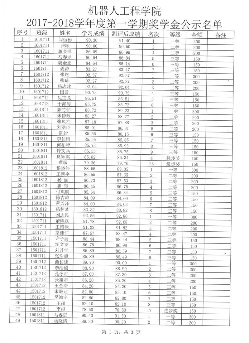 机器人工程学院2017-2018学年度第一学期奖学金公示名单