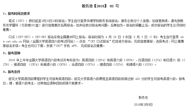 关于2018年上半年全国大学英语四六级考试报名工作的通知