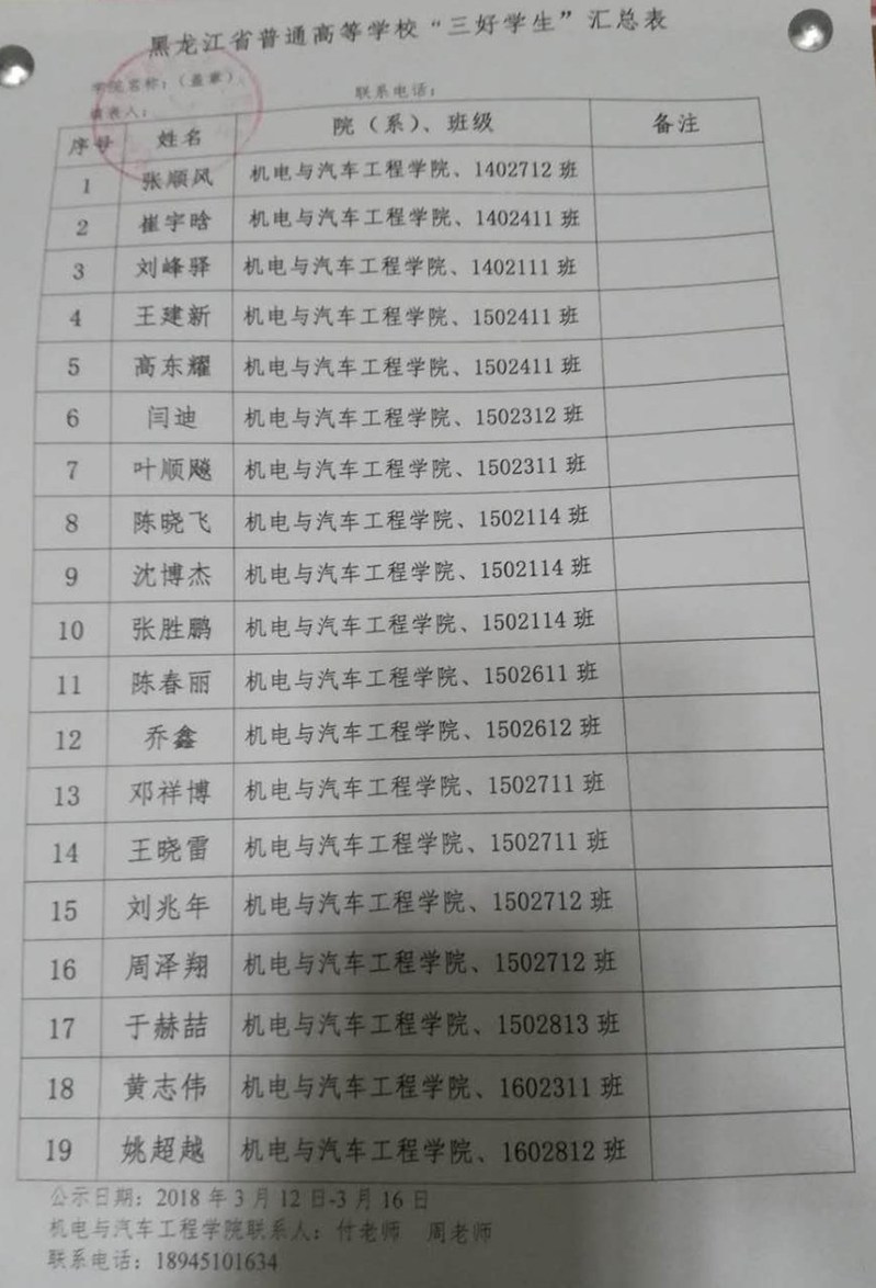 机电与汽车工程学院关于黑龙江省普通高等学校“三好学生”名单公示
