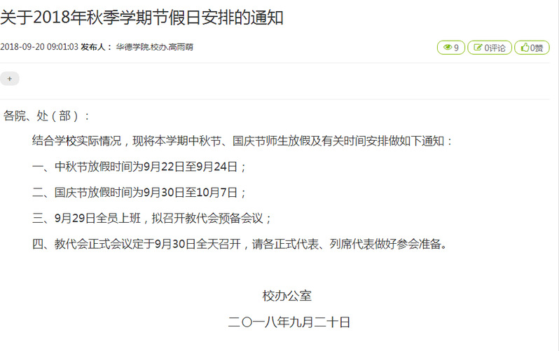 关于2018年秋季学期节日安排的通知