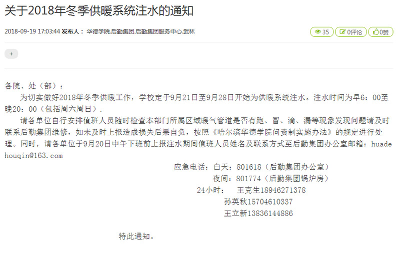关于2018年冬季供暖系统注水的通知