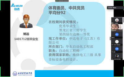 杨凯名老师首先对学院两名现就职于中达电子(江苏)有限公司的2018届优秀毕业生于侃和姚远进行介绍。随后,1401712班毕业生姚远针对自己所在的华东自动化工程部进行了详细介绍,并分享了自己入职两年来的亲身感受,针对各专业所对应的岗位和职业发展讲述了自己的看法。1401711班毕业生于侃针对企业环境和自己所就职的台达应用技术中心工作情况进行了说明,并建议大家入职前要明确目标,提前了解企业各部门的岗位需求和工作内容,这样更有利于双选会应聘目标的实现。