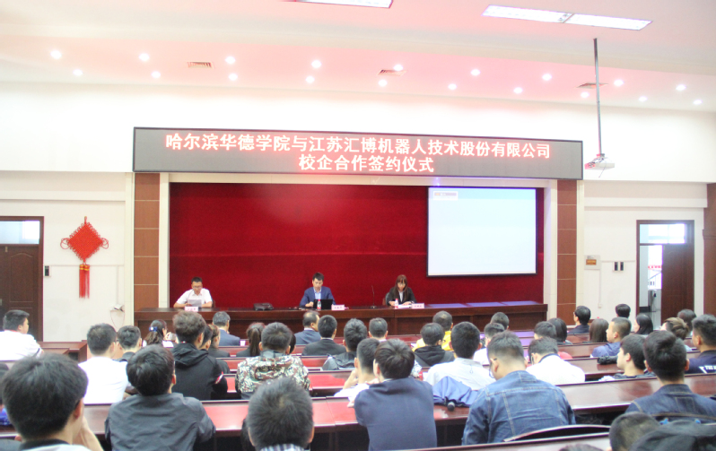 6月9日,澳门电子pg游戏官网与江苏汇博机器人技术股份有限公司校企合作签约仪式在第一教学楼报告厅隆重举行。