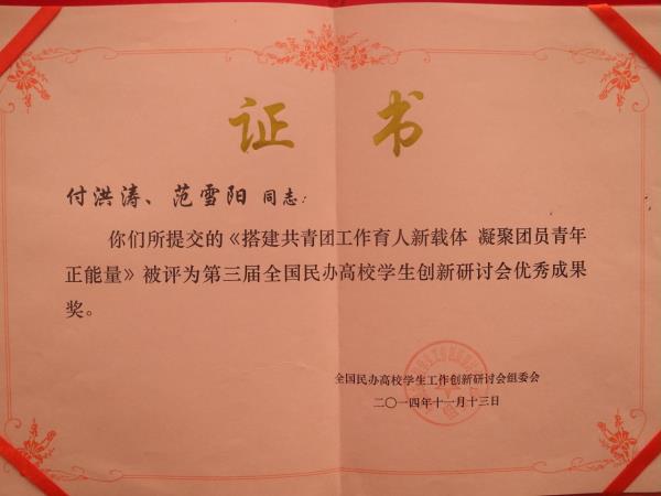 据悉,我校教师付洪涛、范雪阳共同撰写的《搭建共青团工作育人新载体 凝聚团员青年正能量》学生工作成果论文荣获“全国民办高校学生创新研讨会优秀成果奖”,本次研讨会全国获奖论文共计20余篇,我校是黑龙江省唯一获奖的民办高校。