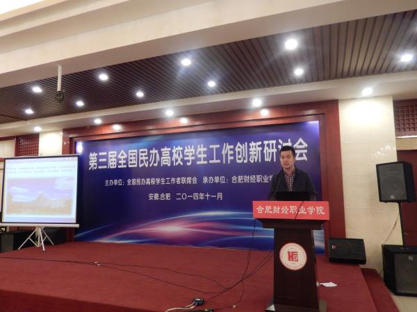 为深入学习宣传党的十八届三中全会精神,围绕立德树人根本任务,落实《普通高等学校辅导员队伍建设规定》要求,分享全国民办高校学生工作典型经验,促进沟通与交流,11月11日至13日,由全国民办高校学生工作者联席会主办的“第三届全国民办高校学生工作创新研讨会”在安徽省合肥财经职业学院隆重开幕,来自全国近百所民办高校的200余名代表参加了此次研讨会,我校机电与汽车工程学院副院长付洪涛应邀参加会议。
