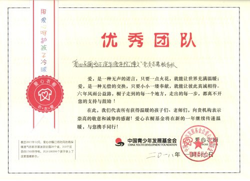 1月27日,我校“博文”党员志愿服务队喜获中国青少年发展基金会爱心衣橱基金管理委员会颁发的“优秀团队”荣誉证书。
