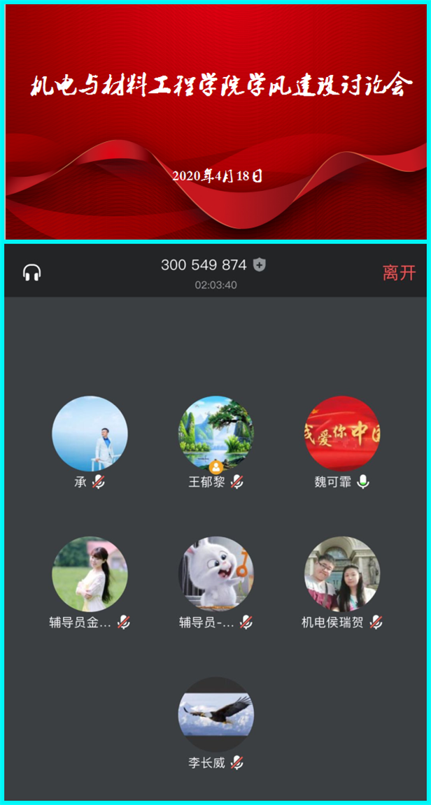 4月18日,为深入贯彻落实全国全省教育大会精神,进一步发挥我校办学育人理念和整体建设理念在培育良好学风方面的重要作用,切实有效做好疫情期间教育教学质量与人才培养质量的双提高。机电与材料工程学院通过【腾讯会议】召开了“雏鹰计划”学风建设工程讨论会。校长助理兼组织部部长魏可霏、校长助理兼机电与材料工程学院院长李长威及学院全体学生工作者参会,会议由学院党总支书记王郁黎主持。