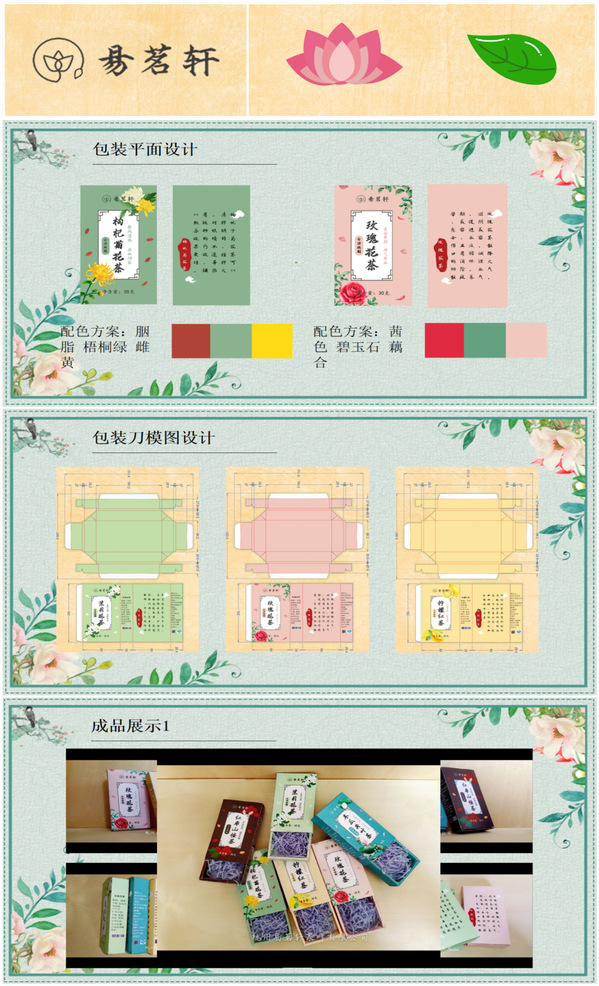 1702911班顾子琦作品:利用纸张彩印的方式,对全套茶叶品牌包装进行视觉和包装设计,体现了学生产品包装设计的专业性和创意性。