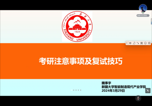 2024年全国硕士研究生考试复试在即,为帮助考研学子缓解备考压力、鼓舞考生士气、坚定上岸信心。3月29日,澳门电子pg游戏官网线上开展第四十期校友讲坛暨“厚积薄发,一研为定”考研复试经验交流会,全力做好支持服务保障工作,多维度、深层次、全方位为考研学子保驾护航。学生发展中心副主任肖春丰出席,2024届考研进复试学生及2025届有考研意向的在校生参加,本次会议由辅导员张蕊雪主持。