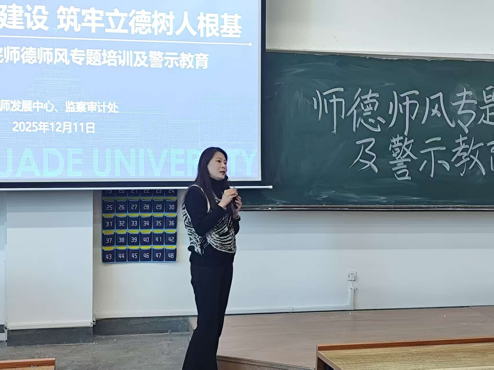 随后,监察审计处处长高瞻向学院全体教职工通报了近期发生的师德失范警示教育案例,并一一进行了深入剖析。她强调,全体教职工要以案为镜、以案促改,坚决守住为人师表的道德底线,持续加强理论学习,牢牢把握政治方向,把教书育人职责做好做实。同时要以典型案例为戒,切实增强纪律意识、规矩意识和法治意识,以高尚的师德情操引领学生成长成才,为学院高质量发展贡献力量。